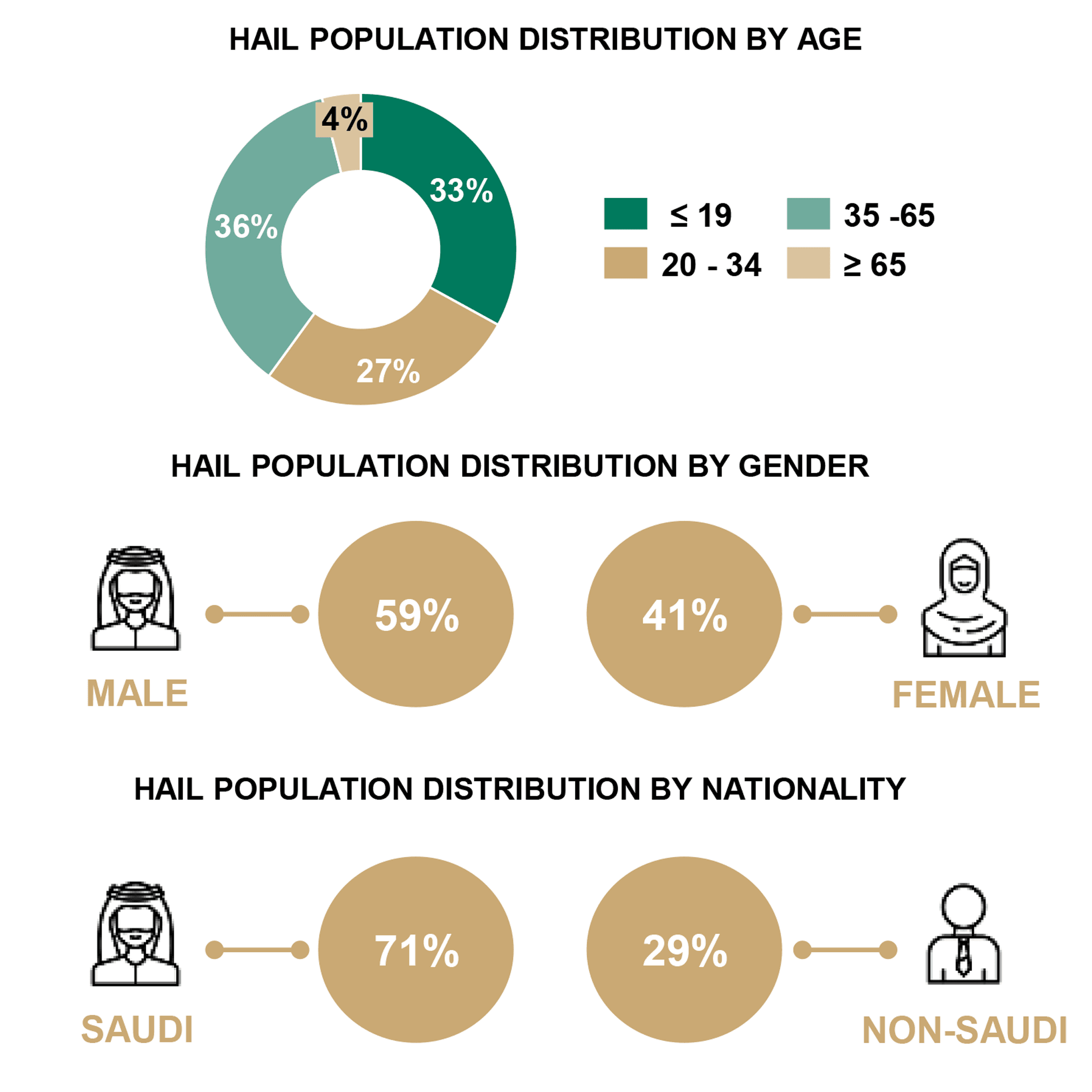 - Hail’s population is considered relatively young with approximately 60% of its population being below the age of 35.