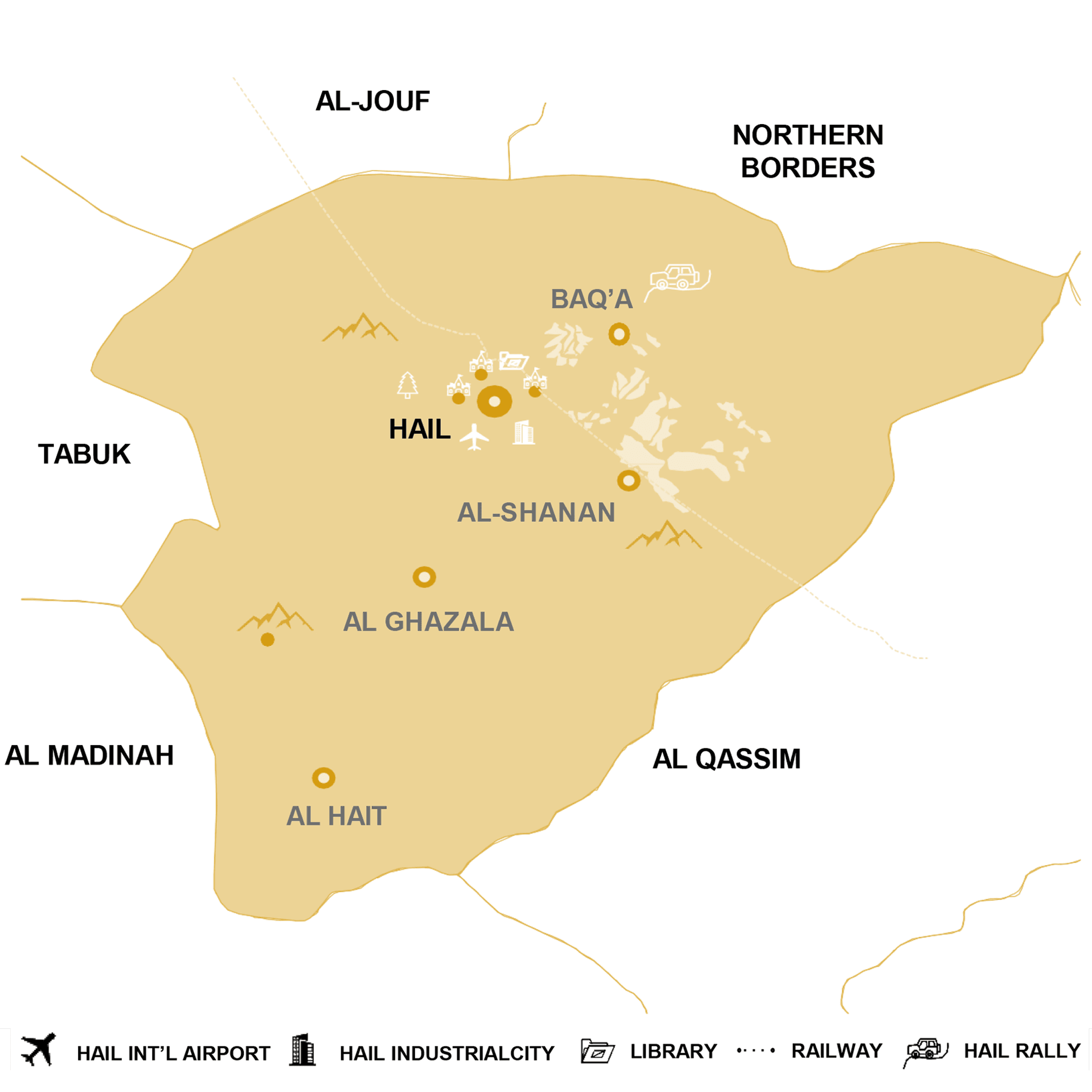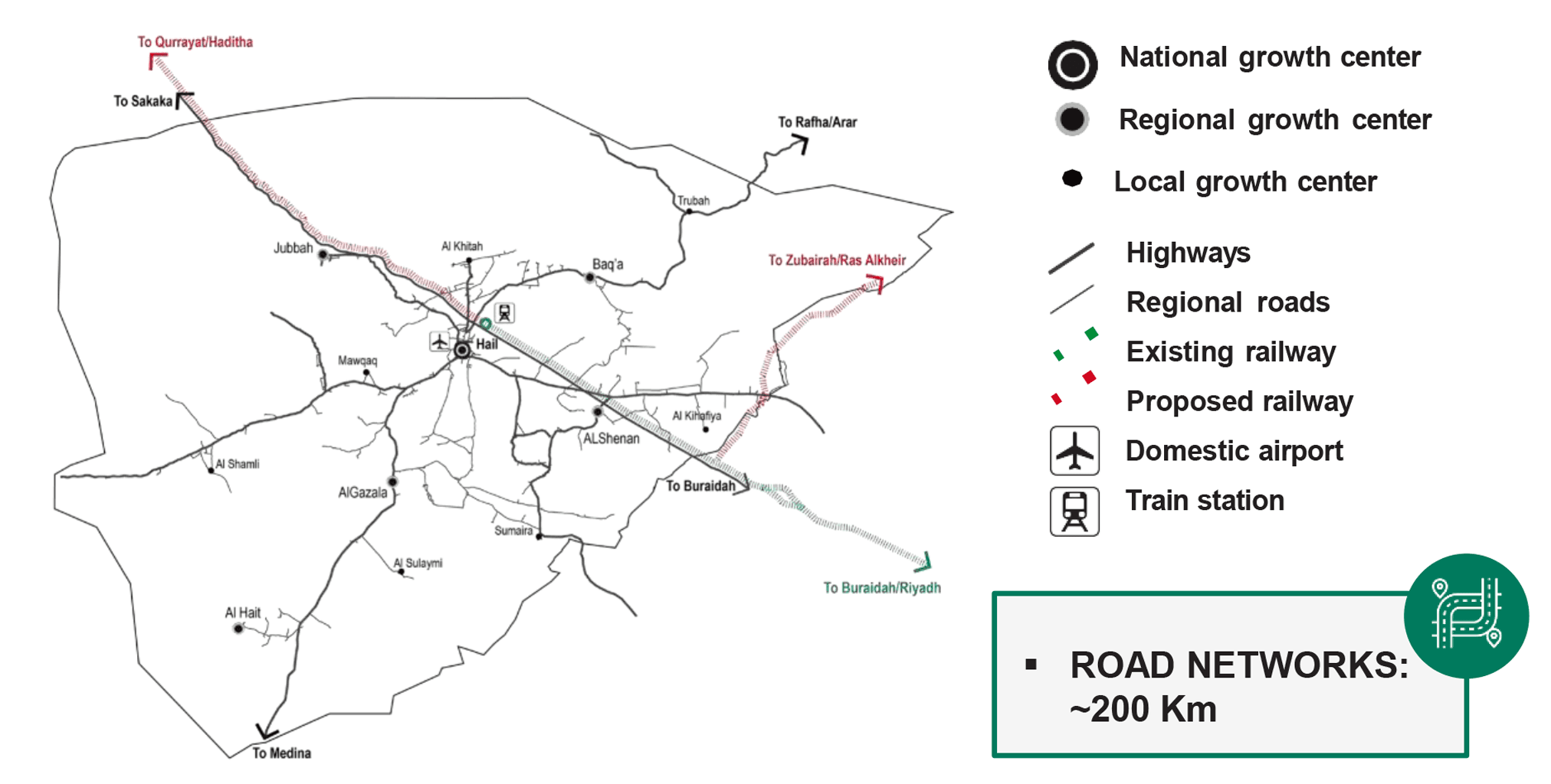 - On Hail region side, the cities are well connected through a road network spanning approximately 200 km. Additionally, the Qurayyat-Buraidah/Riyadh railway line further contributes to the connectivity in the area.