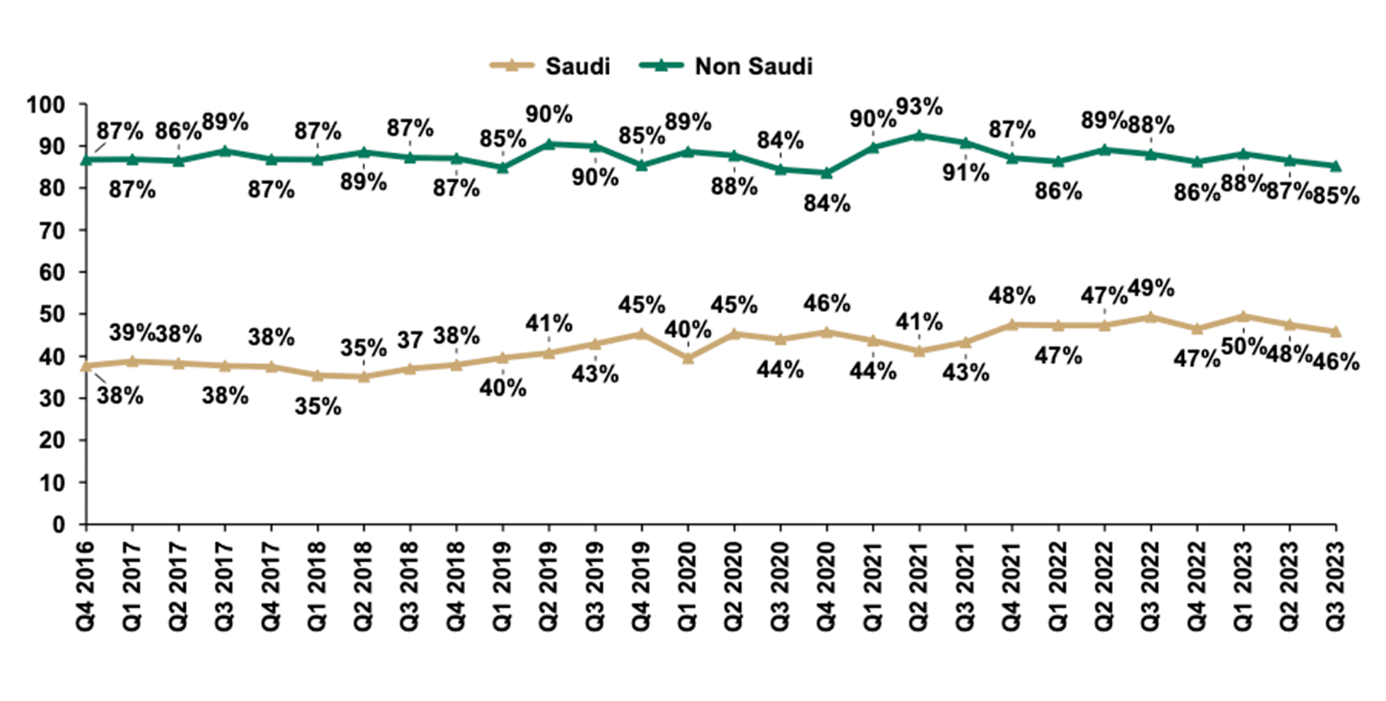 Saudi and Non-Saudi Labor Force Participation Rate, Q4 2016 – Q3 2023