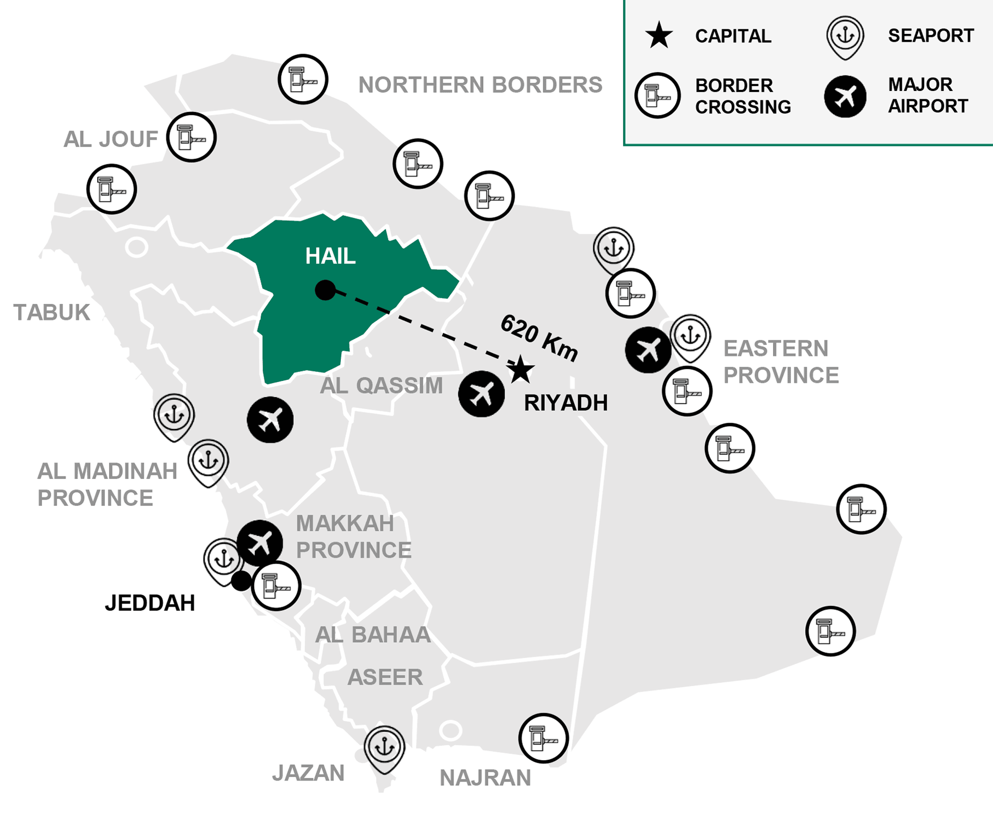 - It is well connected to major airports, seaports and border crossings in KSA through major transport infrastructures nodes and highways at Kingdom level.