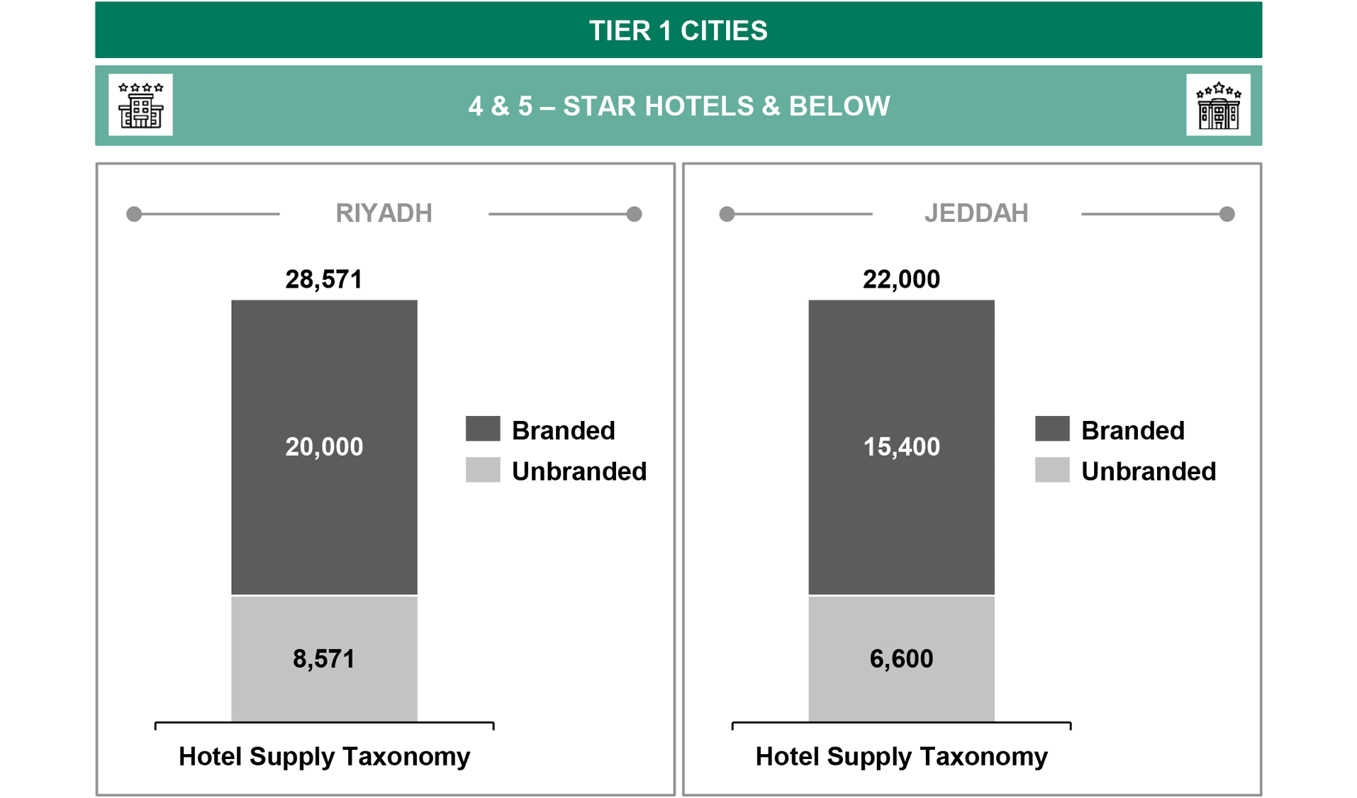 - Tier 1 cities rely heavily on the branded hotels to accommodate international tourists and visitors with high quality offerings (c.80%), similar to Riyadh and Jeddah.