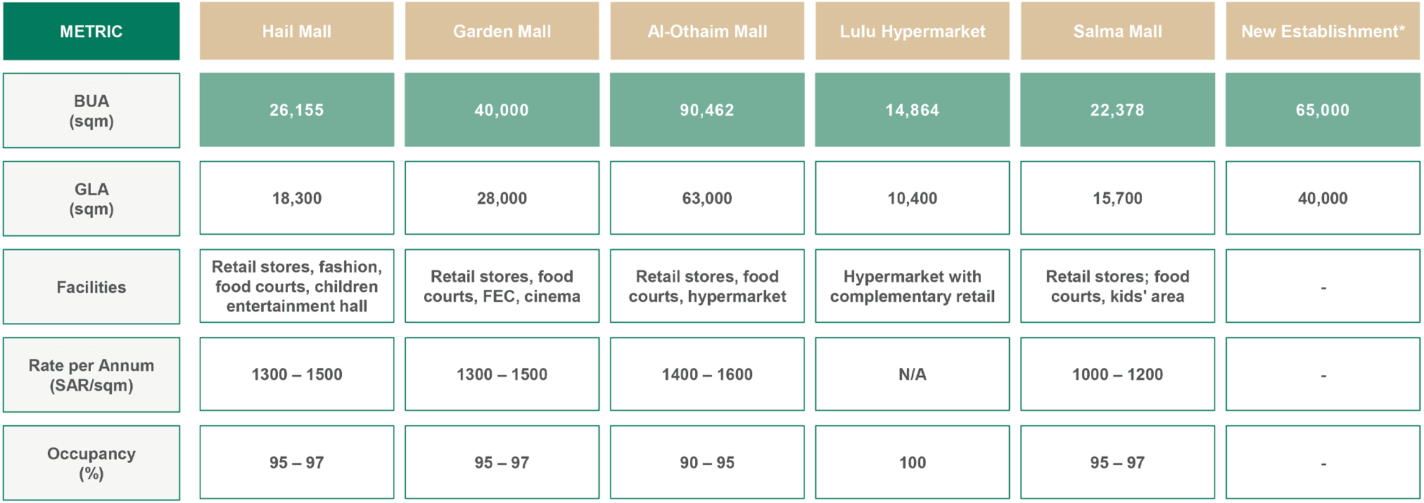 - Al-Othaim mall has both the largest BUA and GLA in the existing retail landscape in Hail.