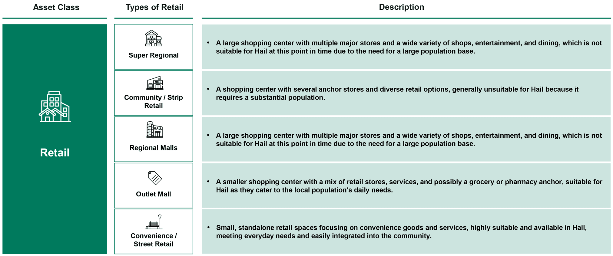 Additionally, a taxonomy for the retail malls was undertaken for Hail’s market to explore the offering options, ranging from super regional and regional, to community, outlet and convenience malls.