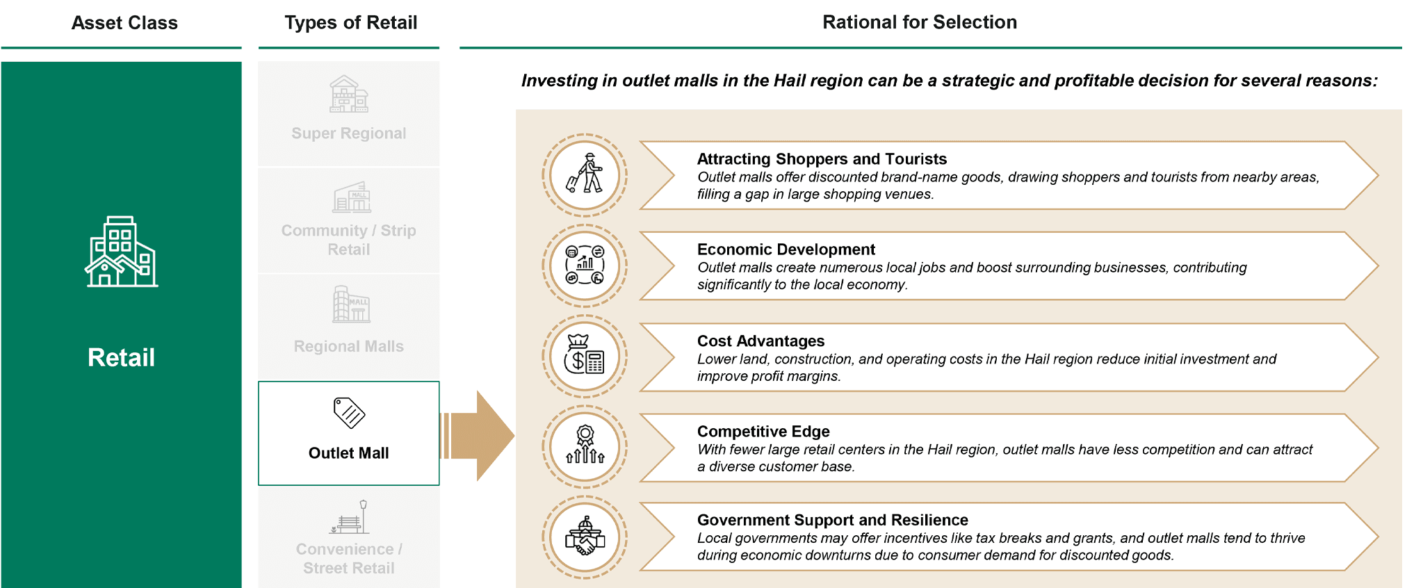 As a consequence, outlet mall option is selected given its strategic importance for tourist attraction, boosting economic development in Hail while leveraging cost advantages and government support.