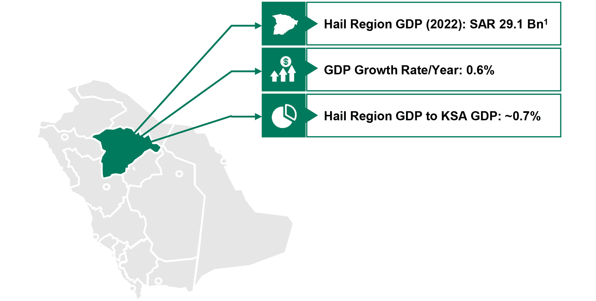 - As part of the Kingdom’s GDP, Hail region GDP to KSA GDP accounted for around 0.7% in 2022.
