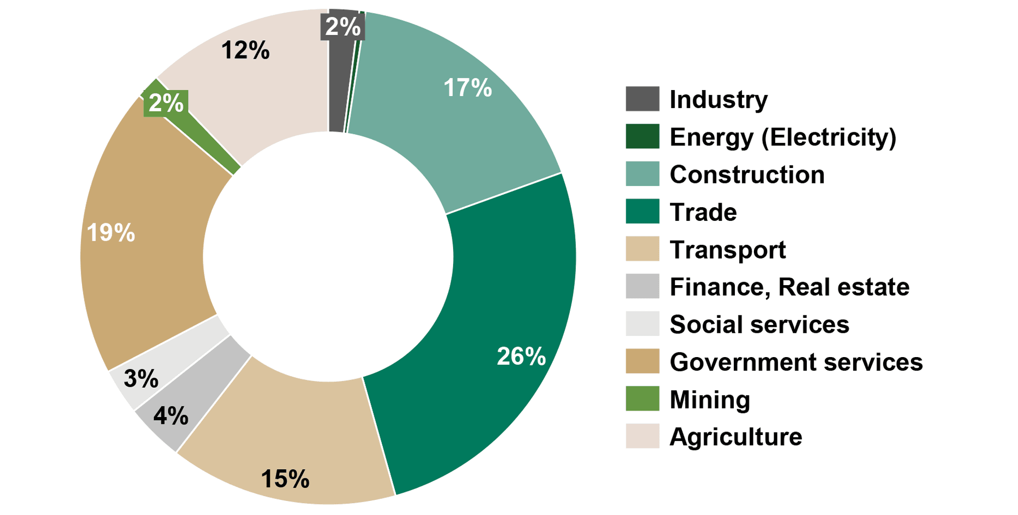 - 10 main sectors contribute to Hail region’s GDP, led mainly by the retail and trade sector at 26% of the region GDP, Government services at 19%, Construction at 17% and 15% for Transport, with other sectors following.